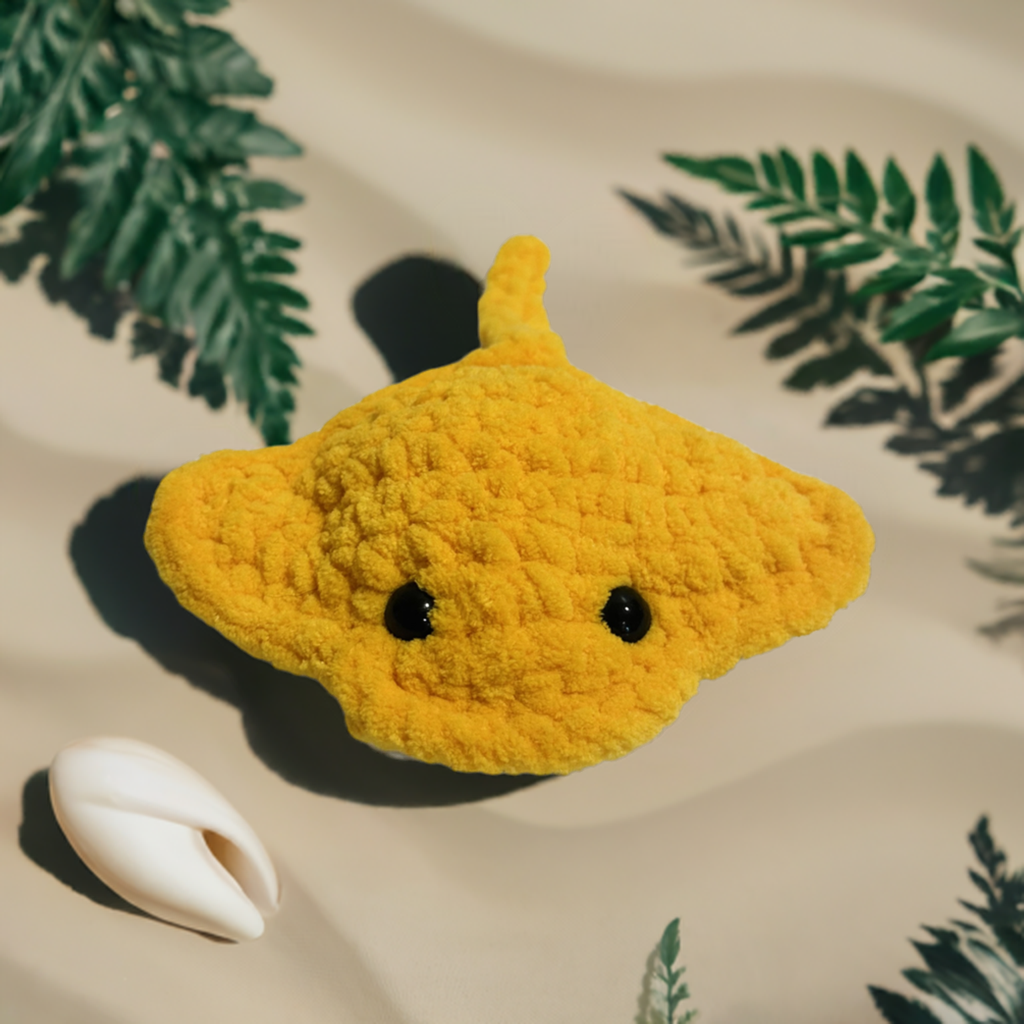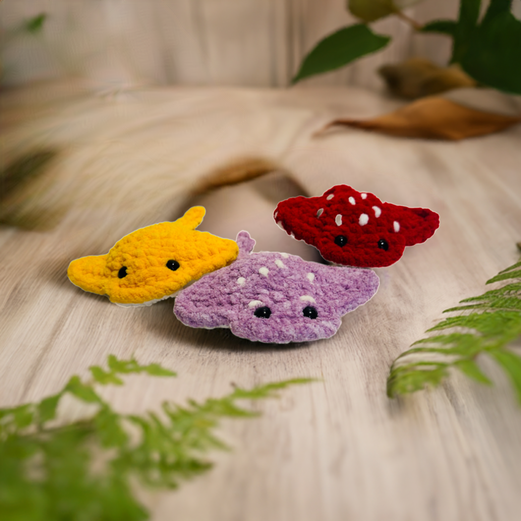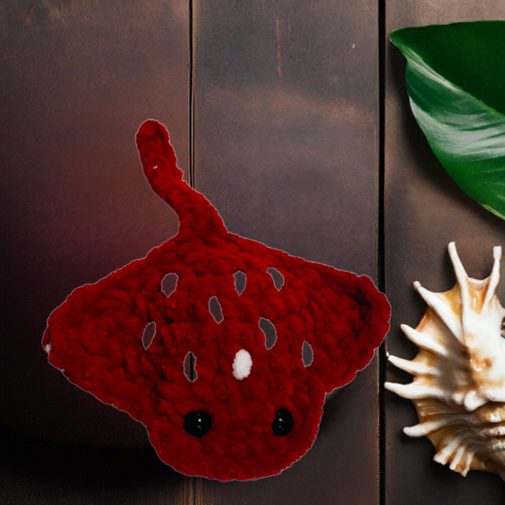 Imagine a crochet stingray, skillfully crafted with soft, smooth yarns in shades of gray and white. Its flat body is elegantly detailed with subtle ridges and delicate fins that give it a lifelike appearance. Its round eyes and gentle smile add a touch of whimsy to its underwater charm. This crochet stingray is both a unique piece of handmade art and a soft, cuddly companion, perfect for ocean enthusiasts of all ages.