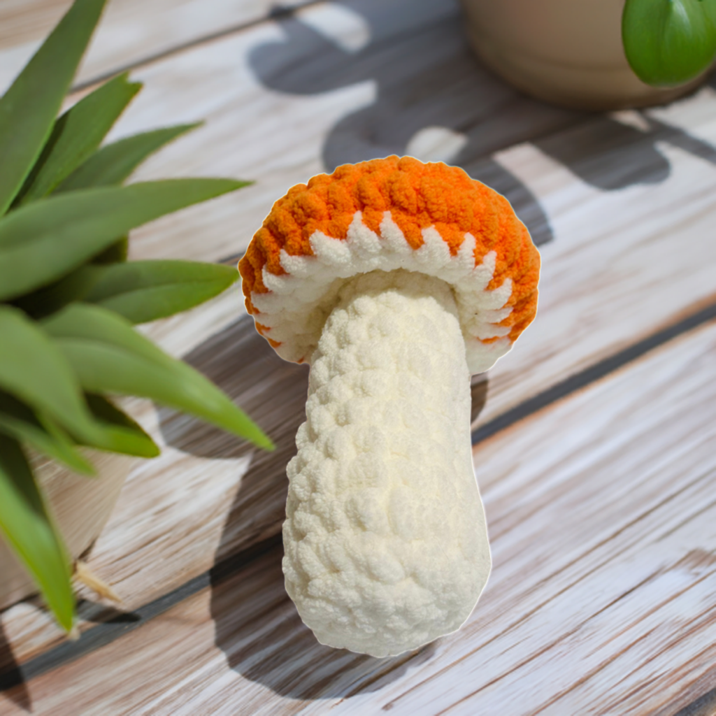Imagine a crochet fungi mushroom, meticulously crafted with soft yarns in earthy tones of browns and greens. Its cap is adorned with intricate stitches that mimic the delicate gills or pores of a real mushroom. The stem is sturdy yet soft, designed to stand upright or sit comfortably on any surface. This whimsical crochet creation brings a touch of nature indoors, perfect for adding a cozy and charming accent to any room or as a unique gift for mushroom enthusiasts.